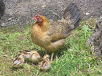 ポリネシア人といっしょにハワイに入植した鳥です。日本語でセキショクヤケイといい、白人が入植した後にハワイにやってきた、いわゆるニワトリ(Domestic Chicken)とは、区別されます。胸の 、きれいな羽の色が特徴です。カウアイ島のコケエロッジの付近に、たくさんいます。 カウアイを訪れた人は誰もが「なんて、ニワトリが多いんだ!」と思うでしょう。 本当に、カウアイは野良(?)ニワトリが多くて、道で轢かれていたりします。 このニワトリたちは、1992年にカウアイを襲ったハリケーン”INIKI”によって多くの鶏舎が壊れ、逃げたニワトリが野生化して増えたものだそうですが、本当でしょうか・・・?私は、INIKIが来る以前のカウアイを知らないので、この話の真偽はわかりませんが・・。