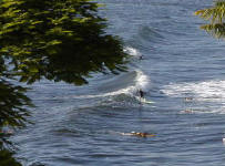岩に当たった水が沸騰したように見えるということは、岩がごろごろしていて、流れが急ということです。もちろん遊泳禁止になっています。 しかし、数人のローカルの男女が、川へのダイビングに興じていました。 特に一人の青年は、背面飛び込みや、回転飛び込みなど素晴らしい大技(?)をきめていました。楽しそうだけど、伝説のクナのように、レインボーフォールまで流されたら大変です。 展望台から左手奥にみえる滝は、PE'E PE'E滝です。 川岸近くまで崖を降りていくこともできますが、やや急で滑りやすいので、注意してください。