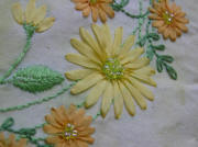 大き目の黄色い花と小さ目のオレンジの花で作ったリースをイメージしてデザインした作品。花の芯はビーズで、花びらはリボンで刺しています。 裏側のパッチワーク部分は、リバティプリントを使用しています。パッチワークのつなぎ目部分をフェザー・ステッチとビーズを刺しています。 いろいろ試行錯誤しながら作った作品ですが、デザインする時も作っている時も、とても楽しかったです。お世話になっている方にプレゼントしました。